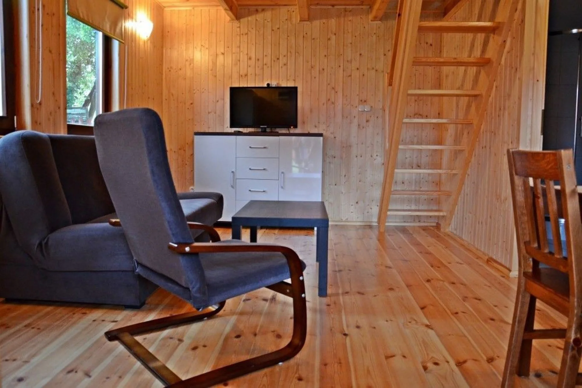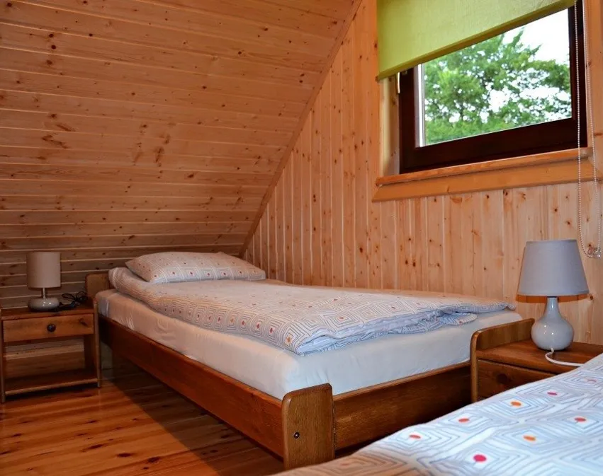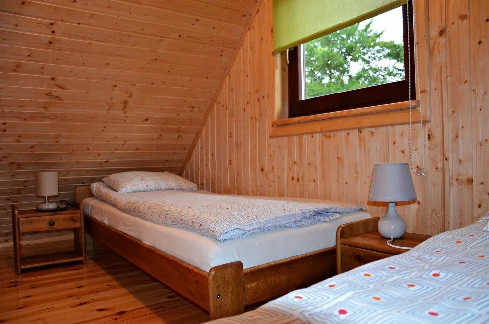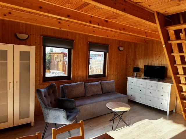 Na piętrze mieszczą się dwie oddzielne sypialnie dwuosobowe, gwarantujące wygodę i prywatność. Każdy domek wyposażony jest w telewizor 32 cale z wyjściem USB, co pozwoli Ci na chwilę relaksu przy ulubionych filmach czy serialach.