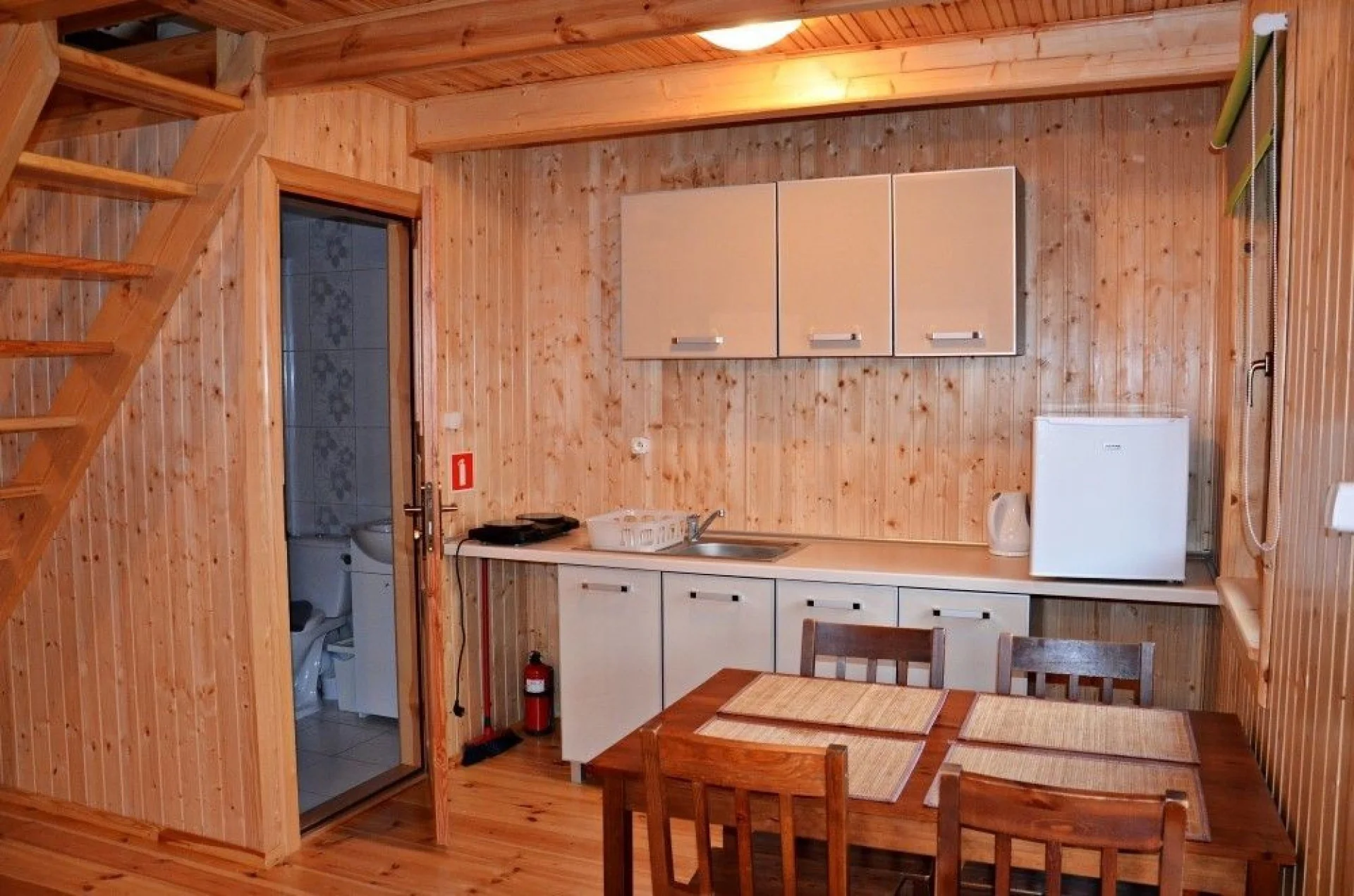 Na parterze znajduje się przestronny salon z aneksem kuchennym oraz łazienka. Aneks kuchenny został w pełni wyposażony w kuchenkę, lodówkę, czajnik elektryczny, garnki, talerze, szklanki i sztućce, dzięki czemu możesz swobodnie przygotowywać posiłki. W łazience do dyspozycji gości jest kabina natryskowa, umywalka, toaleta oraz 50-litrowy bojler, zapewniający ciepłą wodę przez cały dzień.